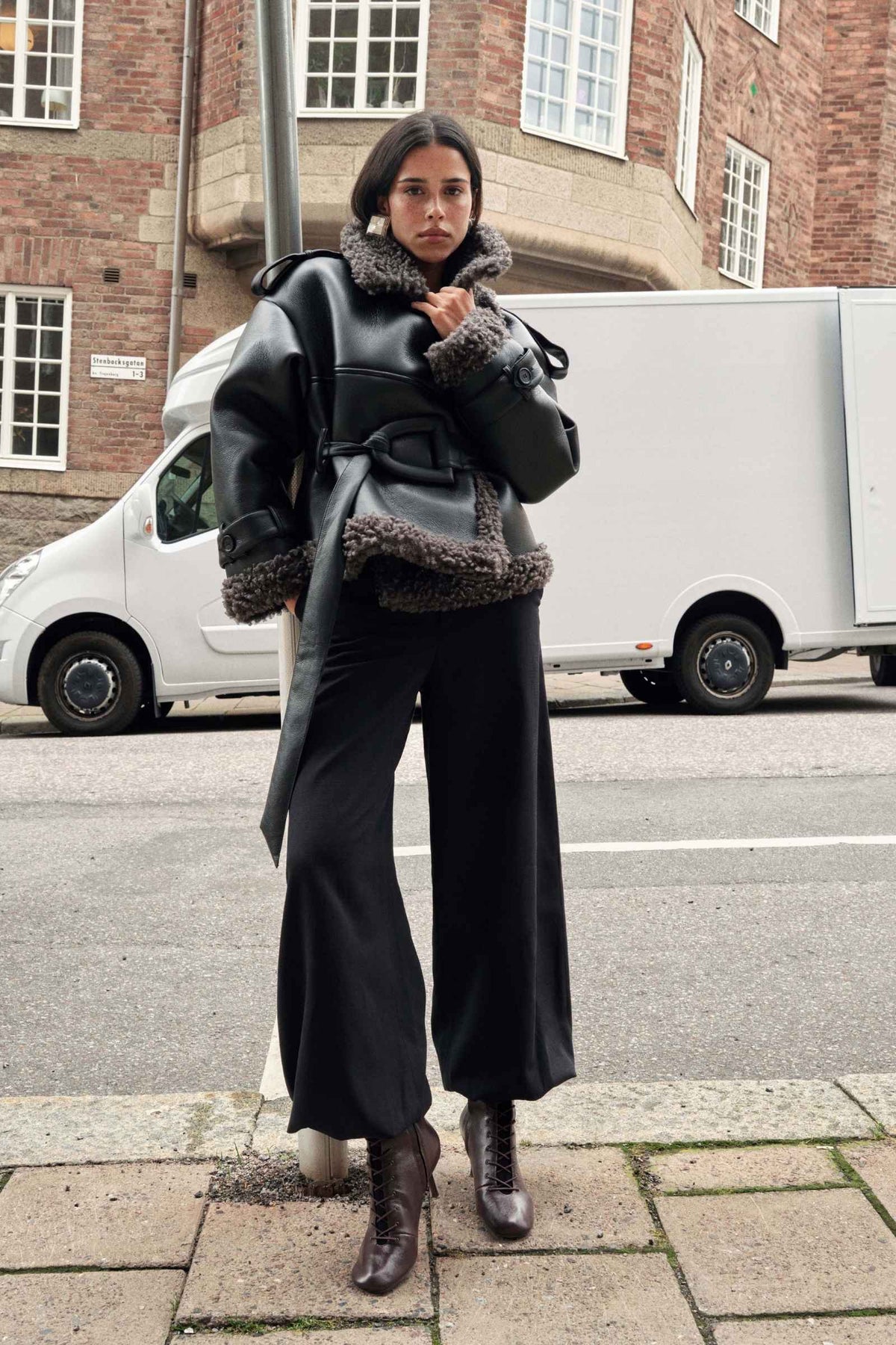 The Savile Cropped Jacket brings together Scandinavian functionality with contemporary luxury. Crafted from supple vegan leather and finished with a plush faux-shearling lining, it delivers refined comfort with a confident silhouette. The oversized cut drapes effortlessly while the cropped length adds a modern, architectural shape — striking the perfect balance between softness and strength.