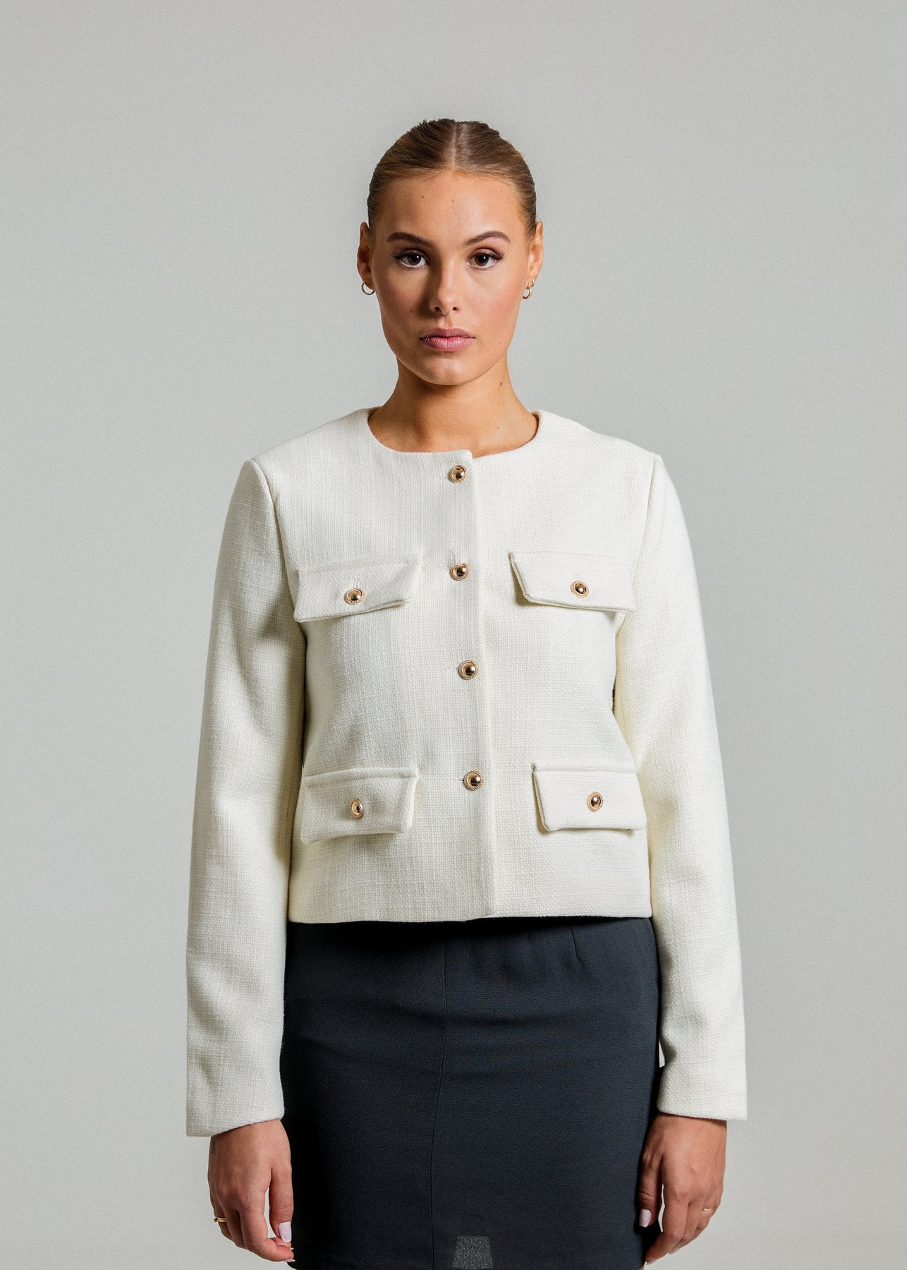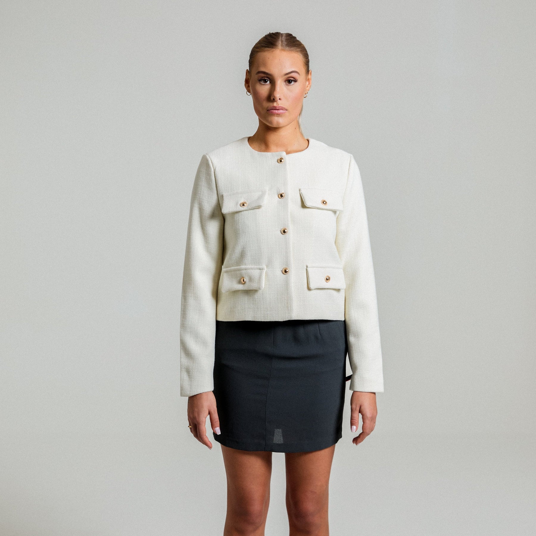 Defined by its cropped cut and soft structure, the Ella Cropped Blazer offers a modern look with textured fabric and gold-tone buttons for a refined finish. This blazer combines style and comfort, perfect for both business and casual looks.